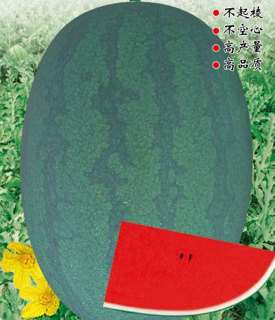 ■ 特征特性 :早熟種,雌花開放果實成熟28天左右。全生育期90天左右。植株長勢穩(wěn)健,抗病抗逆性強,適應(yīng)性廣,易坐果。果實橢圓形,果皮墨綠色底上覆暗條帶,果面光滑無棱帶蠟粉。瓤色深紅,瓤質(zhì)酥脆,中心糖14%左右,口感好,風(fēng)味佳。平均單果重8-10kg左右,大者20kg以上(特殊栽培),一般畝產(chǎn)6000公斤以上。皮厚1.0cm左右,果皮硬度強,耐儲運。
