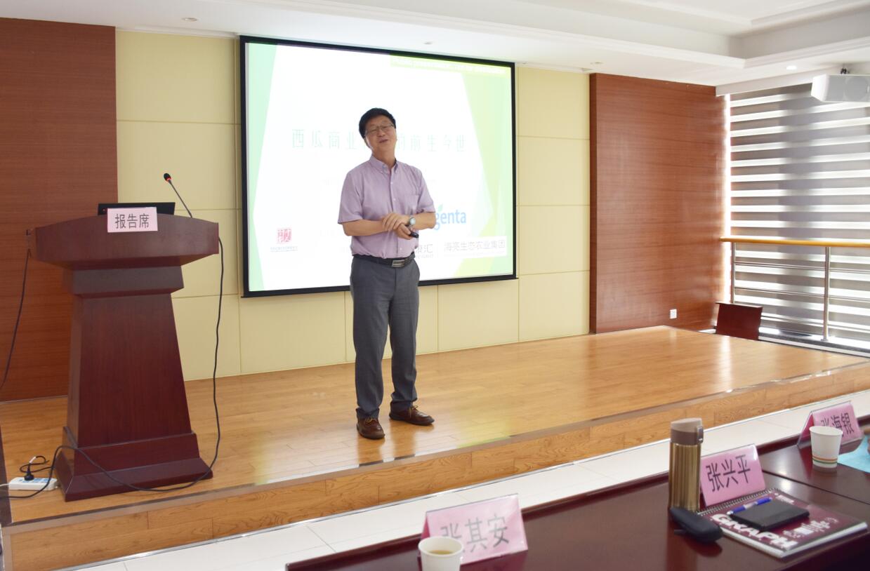 ??? 張興平博士在會上作《國際西甜瓜研究現(xiàn)狀與未來發(fā)展方向的報告》,對西瓜育種前生今世進(jìn)行介紹,就西甜瓜新品種的選育理念、方法、路徑做了生動的講解。
