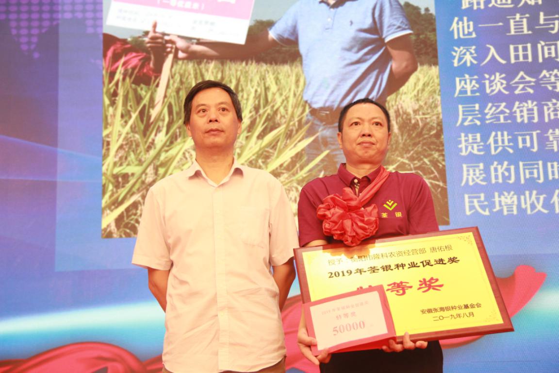 ?? ?隨后,張海銀種業(yè)基金會鄭滿生監(jiān)事宣讀了張海銀種業(yè)基金會“荃銀種業(yè)促進獎”2019年頒獎決定文件。大會向38名在優(yōu)質(zhì)水稻推廣和良種服務等方面取得優(yōu)異成績的個人頒發(fā)了“荃銀種業(yè)促進獎”專項獎。