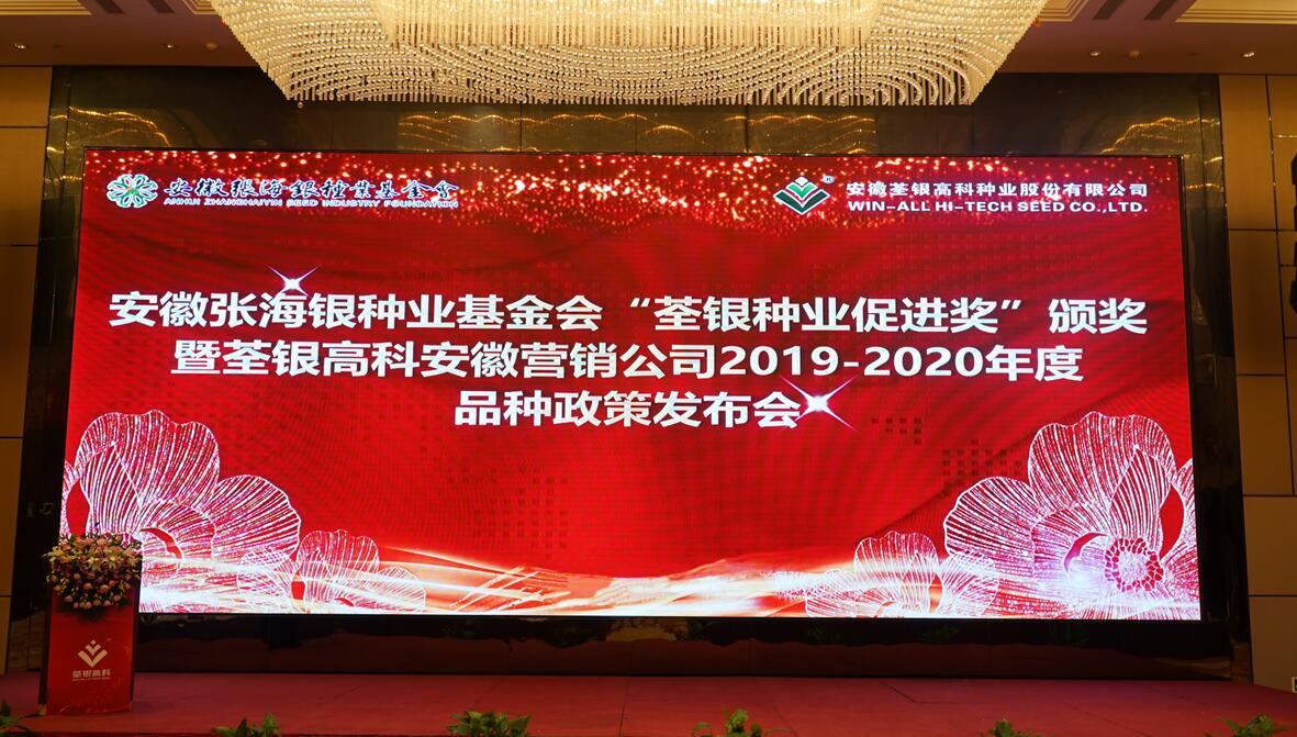 ??? 深耕種業(yè),不忘初心。8月19-20日,安徽張海銀種業(yè)基金會2019年“荃銀種業(yè)促進(jìn)獎”頒獎大會暨荃銀高科安徽營銷公司品種政策發(fā)布會在安徽蕪湖隆重召開。安徽省種子管理總站副站長劉根、中國貿(mào)促會蕪湖市支會會長常拯、蕪湖市種子管理站副站長陳煒平、安徽荃銀高科種業(yè)股份有限公司副董事長兼總經(jīng)理張琴、常務(wù)副總經(jīng)理兼營銷總監(jiān)王玉林、安徽張海銀種業(yè)基金會秘書長張彤、建設(shè)銀行、益海嘉里等單位相關(guān)領(lǐng)導(dǎo)及安徽、江蘇、河南等省近200位種業(yè)精英們參會。